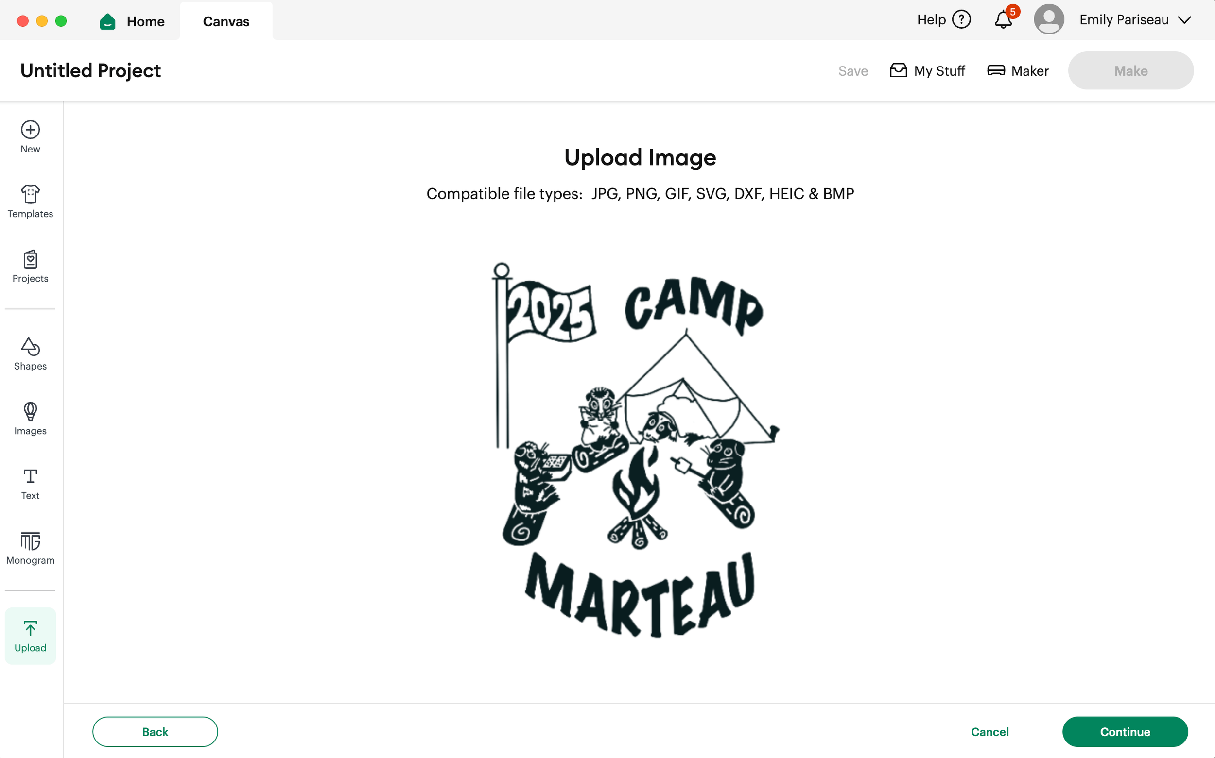 Whether you created your design on Procreate or Canva, download your DIY summer camp shirt design image to a .png file and upload it to Cricut Design Space.