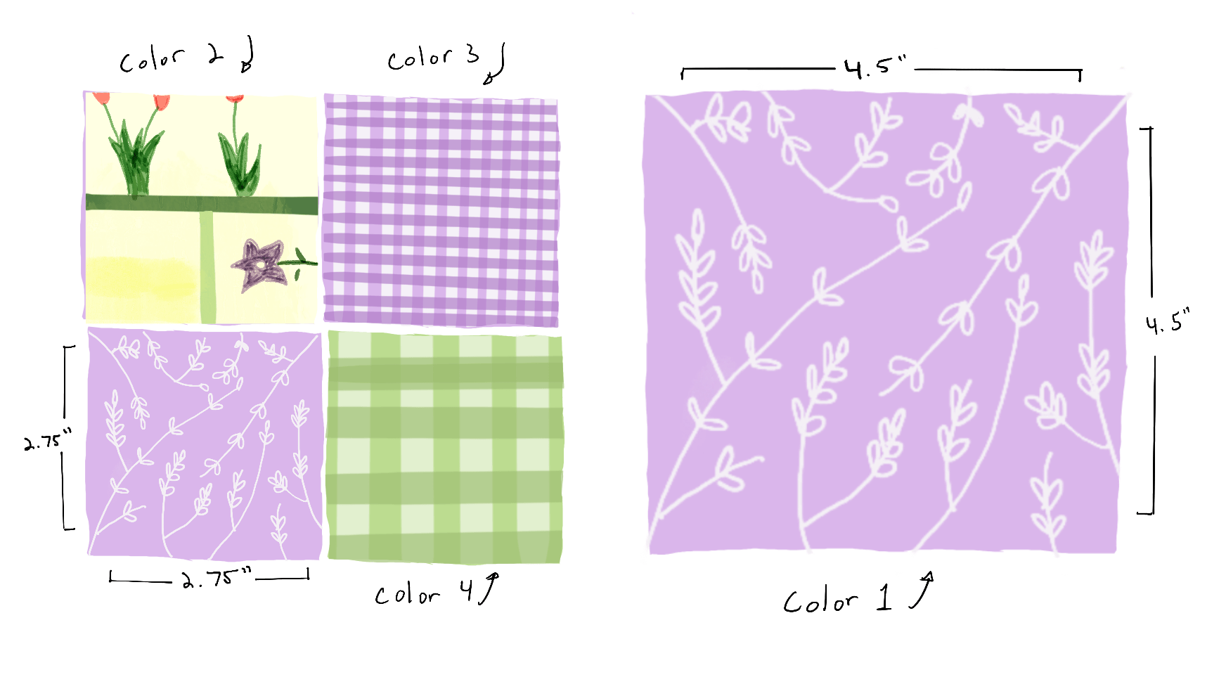 Start by sewing together two of the smaller squares. Sew together colors 2 and 3 along one edge, with 0.5” seam allowance. Repeat this step for colors 1 and 4. Press seams open.
